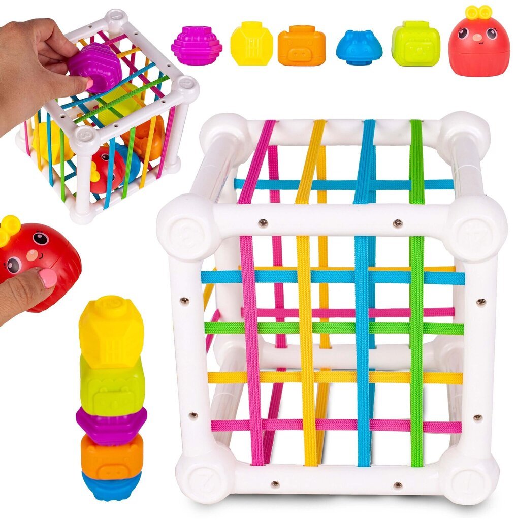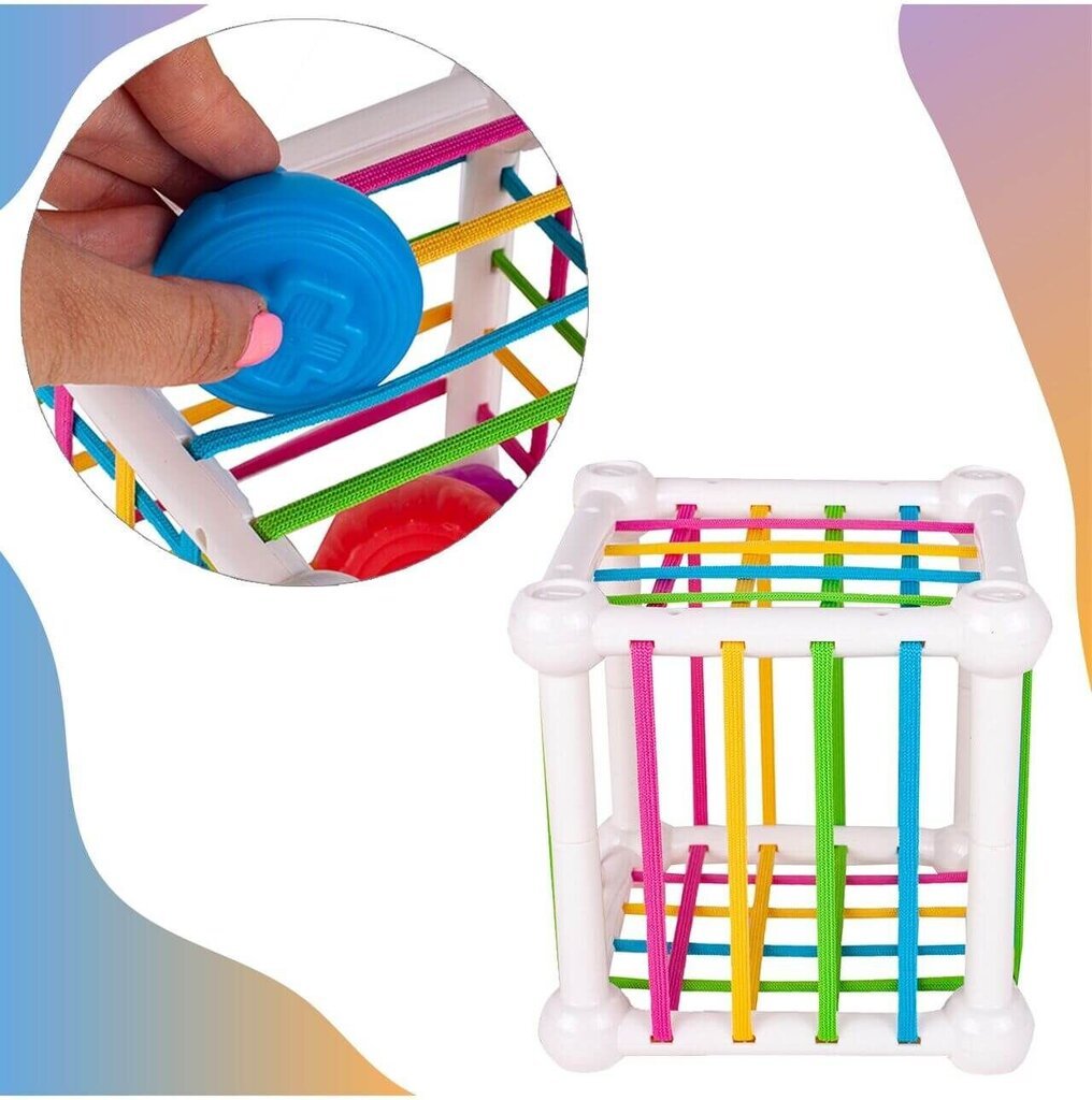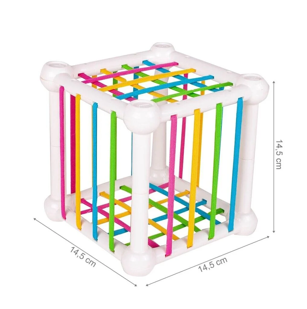 Formų rūšiavimo kubas – spalvingas lavinamasis žaislas, kuris lavina vaikų loginį mąstymą, motorinius įgūdžius ir spalvų bei formų pažinimą. Žaislas tikrai patrauks mažylio dėmesį, nes kiekvienoje kubo pusėje yra skirtingos užduotys: spalvingos guminės juostos bei sienelė su skylutėmis, į kurias reikia priderinti atitinkamas formeles.